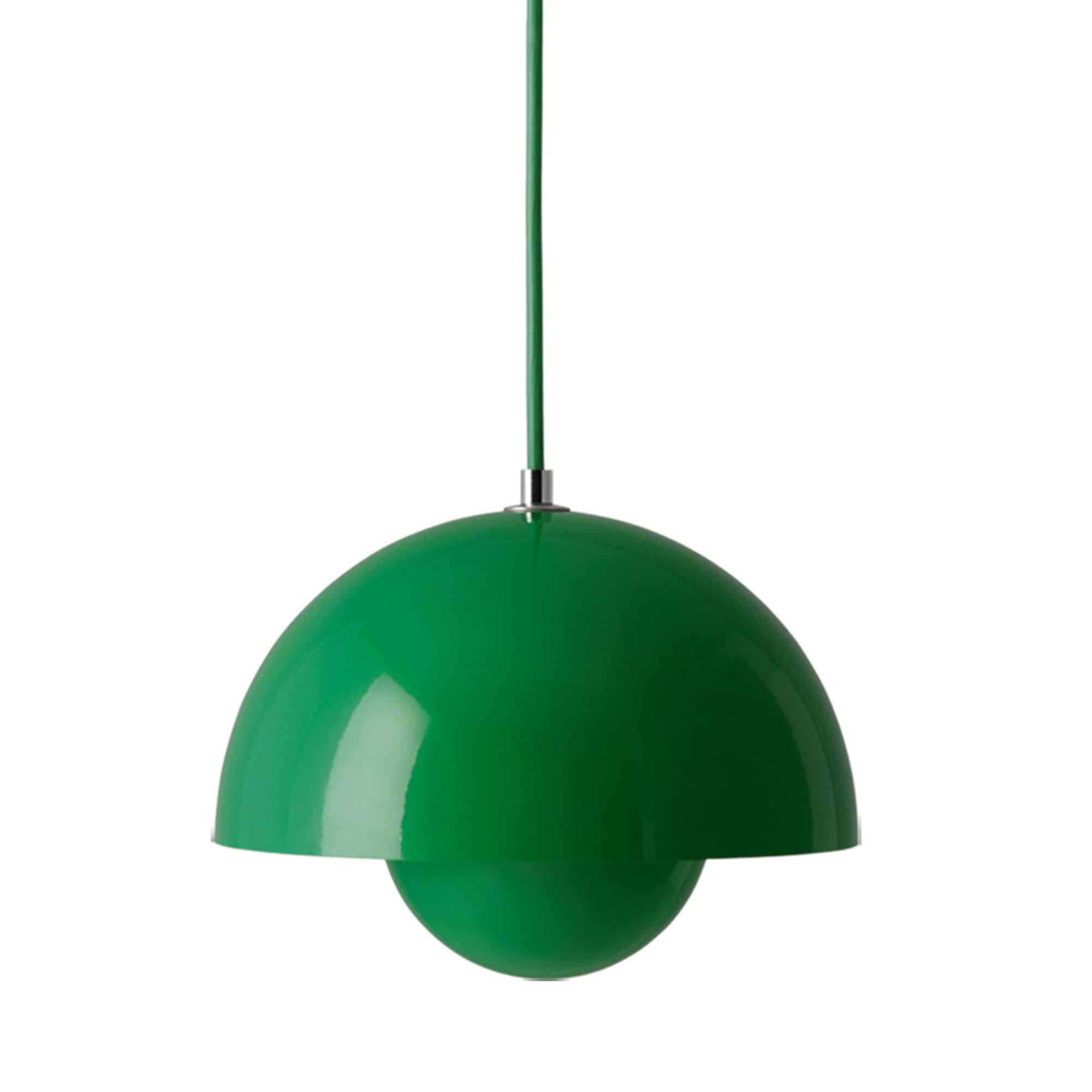 Flowerpot er et ikonisk design, præsenteret her i en farve, der ikke går ubemærket hen. Den klare grønne overflade og den karakteristiske form tilfører rummet både energi og stil. Verner Pantons klassiske design fra 1968 fremstår fortsat aktuelt, og farve
