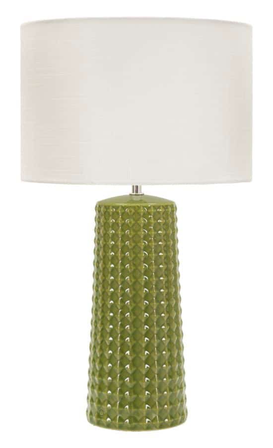 Tilføj et elegant og karakterfuldt element til din indretning med GLISS TABLE LAMP. Lampen har en smuk, blank olivengrøn keramisk base med fine vertikale reliefdetaljer, som giver et eksklusivt og levende udtryk. Kontrasten mellem den dybe grønne farve og